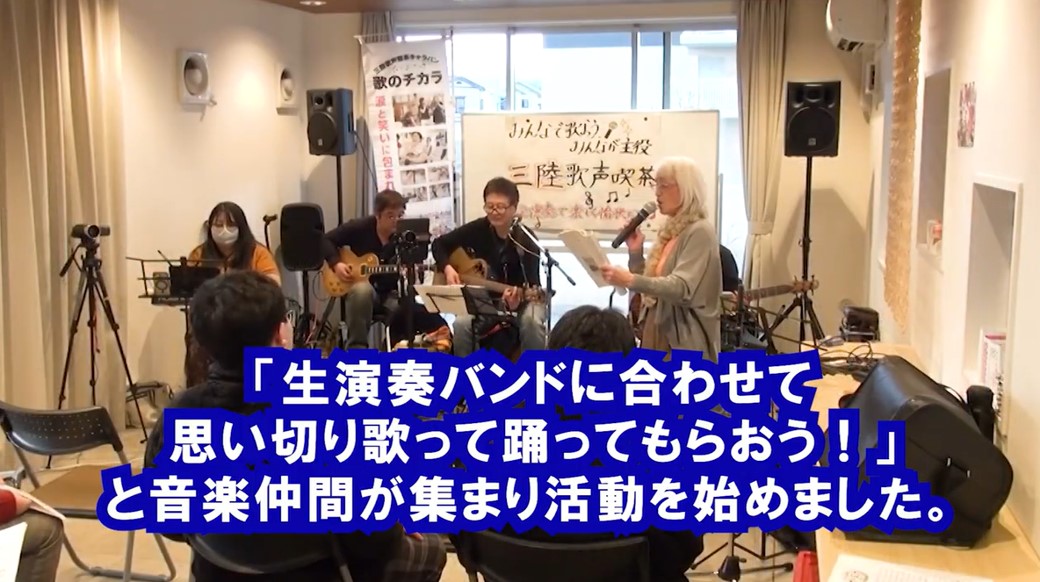 生演奏バンドによるカラオケに合わせて歌って踊って楽しい時間を過ごしてもらう活動です。元々東日本大震災の心の復興支援として被災者向けに活動を開始しました。 最初は大きな声を出してストレス発散してもらうのが目的でしたが、生活環境の変化と共に町づくりやコミュニティ再生のツールになり得ました。カラオケとは違う普段経験できない生演奏ならではの味わいが大人気です。内陸部に避難した方たち向けにも開催する内にこの音楽イベントはいかなる町でも望まれる地域福祉活動としても活用できることが分かりました。 何処の自治体でも高齢者の引篭もりや孤独死が問題になっている今こそ、私たちの活動が多くの方たちの先駆けとなり、全国の音楽愛好家たちに拡がっていくことを熱望しております。若い世代にも広く認知してもらい次なる担い手づくりにも努力しています。 |