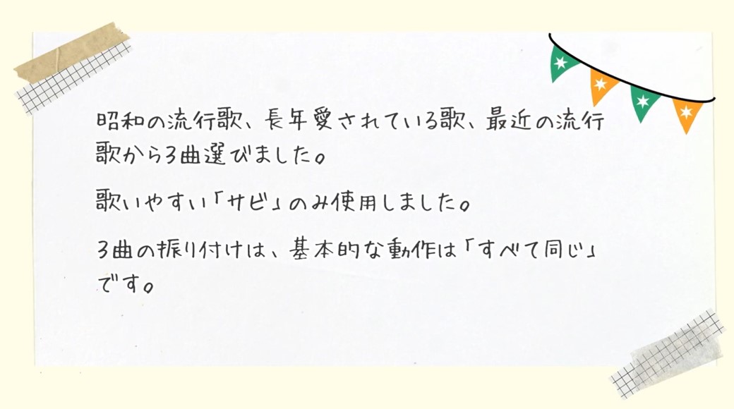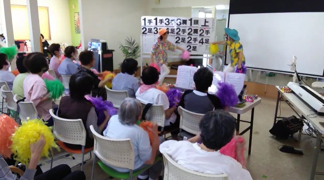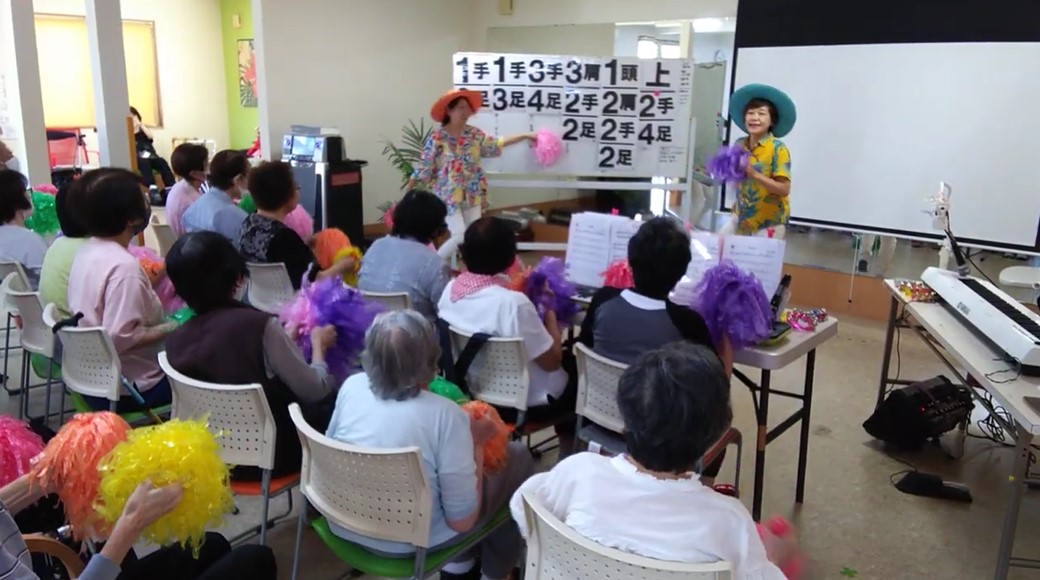 | 音楽レクリエーションの内容 | 高齢者から子どもまで誰でも簡単に楽しくできる体操を職員で制作しました。歌を歌いながら体操することで脳を活性化し、歌詞には時間や景色を感じられる要素を取り入れて認知症予防を意識しました。曲は20年以上音楽業界で活動していた職員が覚えやすいメロディでリズミカルに仕上げ、歌詞は認知症介護指導者が一日の流れを感じられる内容に工夫しました。振付、撮影、編集もすべて職員が担当。事業所が遠方の職員には事前に練習用動画を送付し、全員で集まったのは撮影当日が初めてでした。参加したのは61歳の職員3人と50代40代30代の職員各1人の計6名で世代を超えて一緒に取り組みました。 |