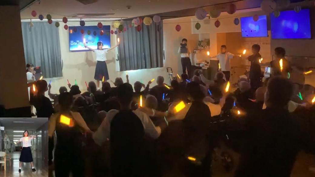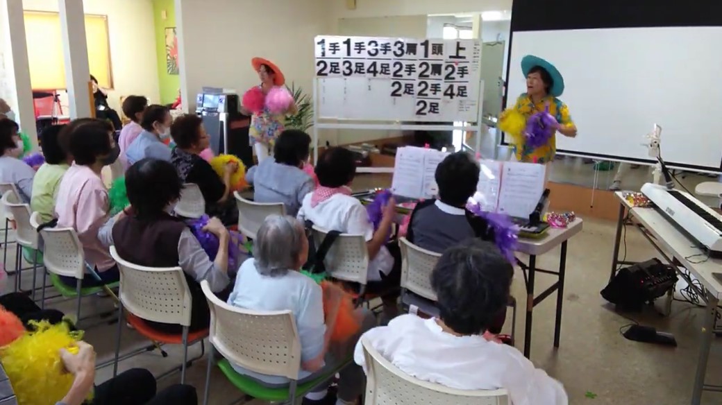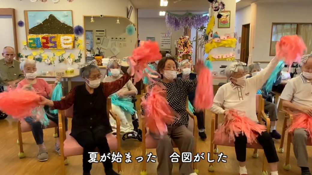 | 音楽レクリエーションの内容 | 高齢者から子どもまで誰でも簡単に楽しくできる体操を職員で制作しました。歌を歌いながら体操することで脳を活性化し、歌詞には時間や景色を感じられる要素を取り入れて認知症予防を意識しました。曲は20年以上音楽業界で活動していた職員が覚えやすいメロディでリズミカルに仕上げ、歌詞は認知症介護指導者が一日の流れを感じられる内容に工夫しました。振付、撮影、編集もすべて職員が担当。事業所が遠方の職員には事前に練習用動画を送付し、全員で集まったのは撮影当日が初めてでした。参加したのは61歳の職員3人と50代40代30代の職員各1人の計6名で世代を超えて一緒に取り組みました。 |